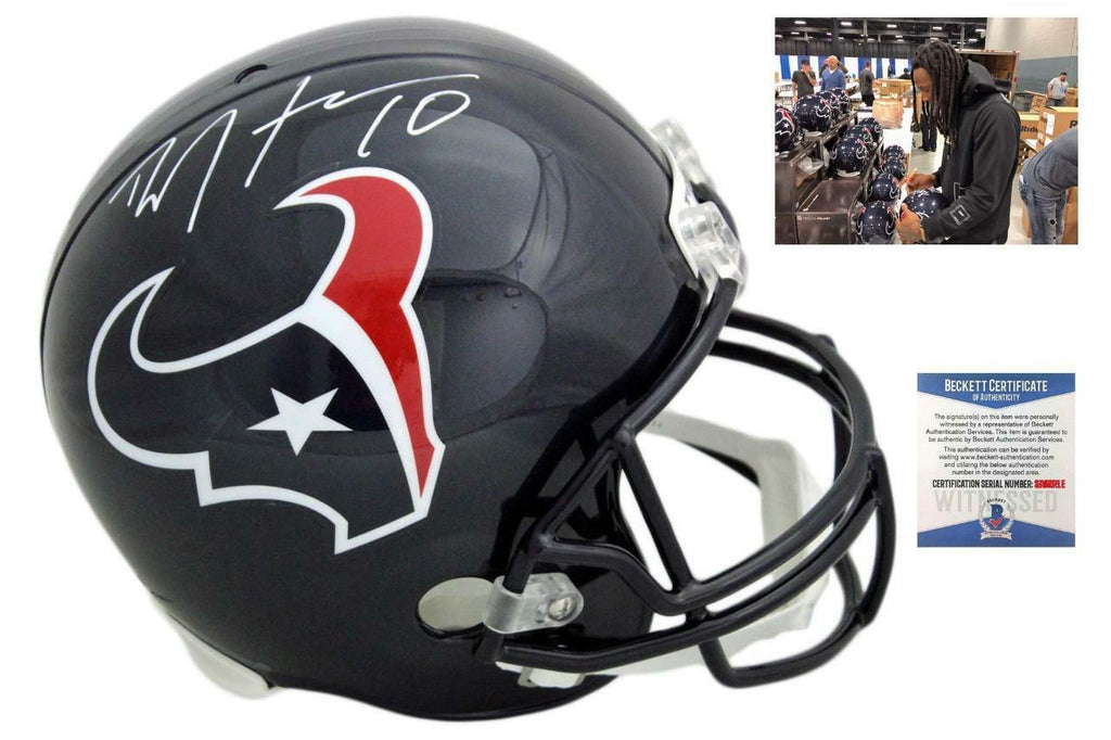 This signed item is brand new in box. This item will make a great gift or a great addition to any collection at an AFFORDABLE PRICE! ATHLETE: Deandre Hopkins ITEM: Houston Texans Full Size Replica Helmet AUTHENTICATION: This item comes with a Beckett "Witnessed" Certificate of Authenticity and serial #'ed hologram affixed to the item. To ensure authenticity, the hologram can be reviewed online. This process helps to ensure that the product purchased is authentic and eliminates any possibility of duplication or fraud. This item was signed in the presence of a Beckett representative.