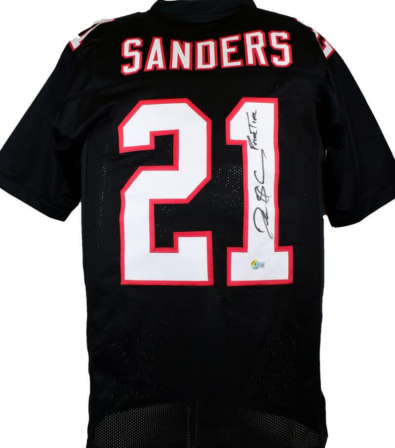 Deion Sanders Autographed Black Pro Style Jersey w/Primetime- Beckett W Hologram *Black THIS IS NOT AN NFL JERSEY. THIS HAS NO TAGS, NO LOGOS, NO EMBLEMS. This is a hand autographed Jersey of Deion Sanders. This is Custom Made (non name brand) Authentic Style (stitched letters and numbers) Jersey. Inscribed Prime Time. This item has a Beckett Witnessed Authentication, which comes with a numbered sticker hologram and a QR code for verification. You can view this item on the Beckett Authentication website, it shows when and where the item was signed. It was signed either at a public autograph appearance or a private signing. This is a stock photo of the item. Although you may not receive this exact item, the item you receive is virtually identical and brand new in great shape. Jersey size is XL.