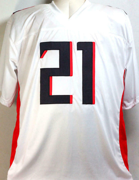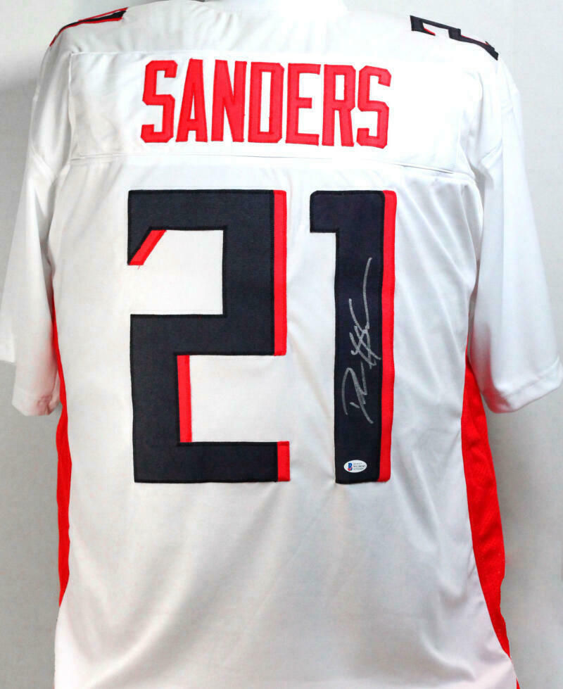 Deion Sanders Autographed NEW White Pro Style Jersey - Beckett W Auth *SILVER THIS IS NOT AN NFL JERSEY. THIS HAS NO TAGS, NO LOGOS, NO EMBLEMS. This is a hand autographed Jersey of Deion Sanders. This is Custom Made (non name brand) Authentic Style (stitched letters and numbers) Jersey. This item has a Beckett Witnessed Authentication, which comes with a numbered and a matching Beckett Certificate of Authenticity. You can view this item on the Beckett Authentication website, it shows when and where the item was signed. It was signed either at a public autograph appearance or a private signing. This is a stock photo of the item. Although you may not receive this exact item, the item you receive is virtually identical and brand new in great shape. Jersey size is XL.