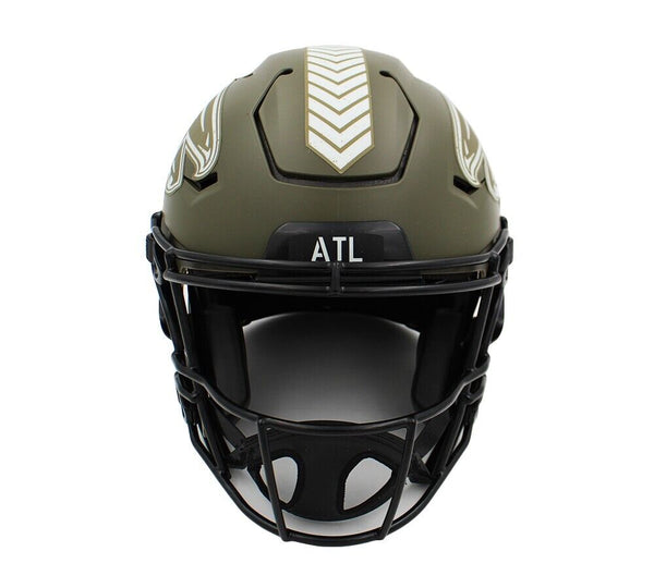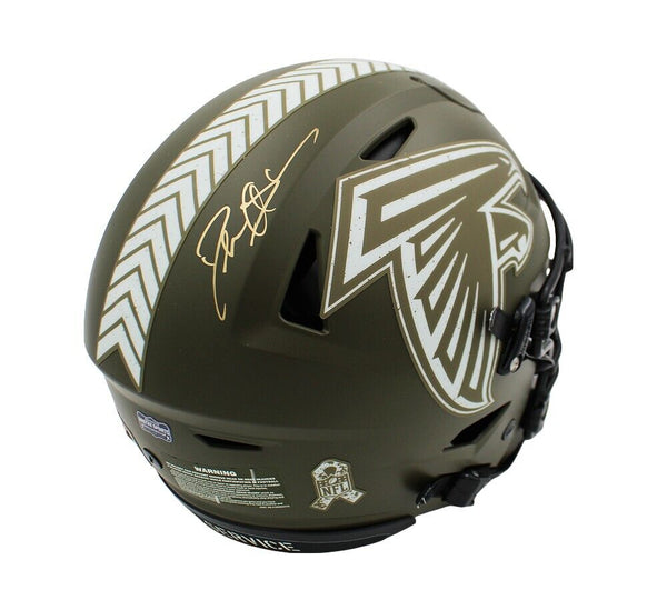 An Atlanta Falcons Speed Flex Authentic Salute to Service NFL Helmet hand signed by Deion Sanders. The item and signature are in excellent condition. Deion is a 2x Super Bowl Champion, 8x Pro Bowler, in the Atlanta Falcons Ring of Honor and dominated two sports during his career. AUTHENTICATION: Your item has been tagged with a SmarTag powered by Prova Technology, which gives you digital access to your items authentication records, including a proof picture from the signing.