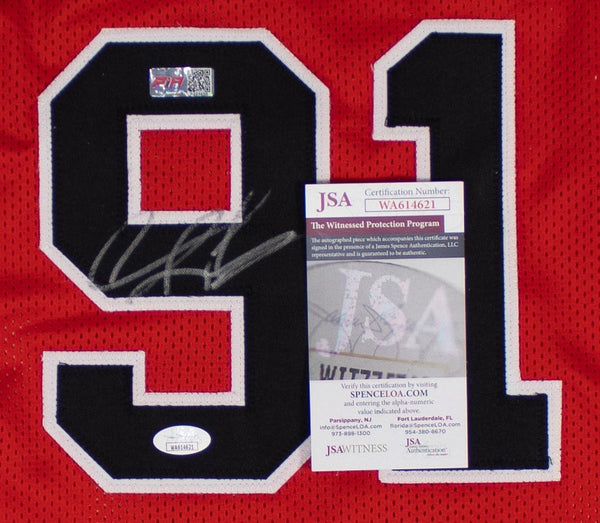 Custom on-court style jersey. Everything is sewn on, size XL. Has been hand-signed by Dennis Rodman (HOF).Dennis Rodman played for 5 teams throughout his NBA career. He was nicknamed "The Worm" and was known for his fierce defensive and rebounding abilities.Rodman earned NBA All-Defensive First Team honors seven times and won the NBA Defensive Player of the Year Award twice. He also led the NBA in rebounds per game for a record seven consecutive years and won five NBA championships. The lot / autograph(s) includes an official James Spence Authentication (JSA) hologram and matching COA for authenticity purposes. The signing of this item was witnessed by JSA.Authentication: JSA COA