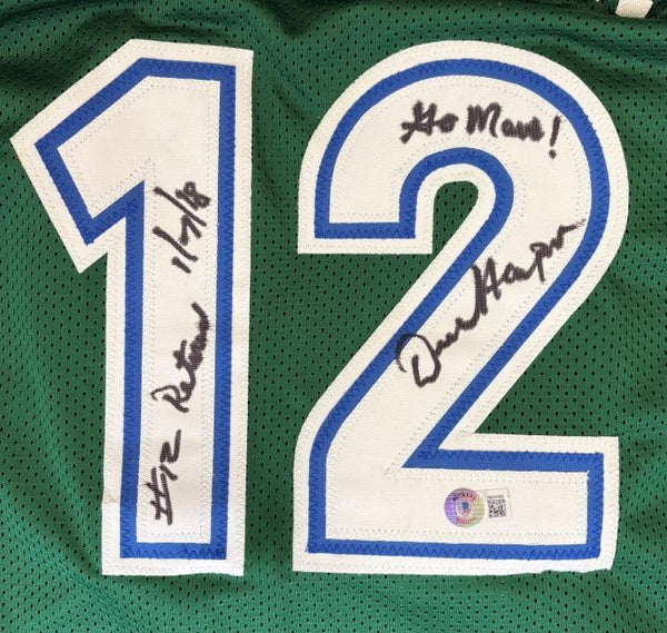 Featured is a Derek Harper signed custom basketball jersey, inscribed "#12 Retired 1/7/18" and "Go Mavs!". This jersey has been hand signed by Harper and comes with the Beckett hologram and certificate of authenticity. This jersey features professionally sewn letters and numbers and is size XL. This jersey has no team tags or emblems and is intended as a sports collectible. This jersey would make a great addition to any sports memorabilia collection! SPECIFICATIONS Autographed By: Derek Harper Team: Dallas Mavericks Sport: Basketball Authentication: Beckett Grading Services