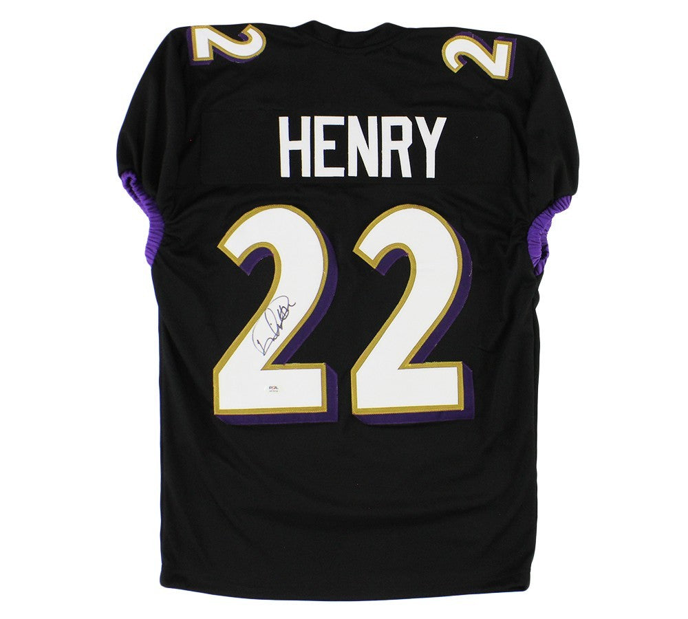 A Baltimore Custom Black Jersey hand signed by Derrick Henry. The item and signature are in excellent condition. Derrick Henry is an American professional football player, widely regarded as one of the most dominant running backs in the NFL. He has broken multiple records, including becoming the eighth player in NFL history to rush for over 2,000 yards in a season. He has earned multiple Pro Bowl selections and All-Pro honors. AUTHENTICATION: The item is accompanied by a PSA Serial Numbered and Databased Hologram.