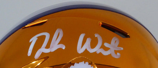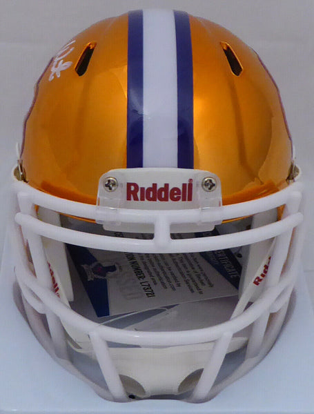 This is a Clemson Tigers Orange Chrome Speed Mini Helmet that has been hand signed by Deshaun Watson. A This item has been certified authentic by Beckett Authentication (BAS) and comes with their sticker and matching certificate of authenticity. A A NOTE: The chrome helmets have a tag on them reading: "Due to the vacuum-metallization process used on the shell, your helmet may come with minor imperfections, which are unavoidable." A