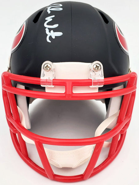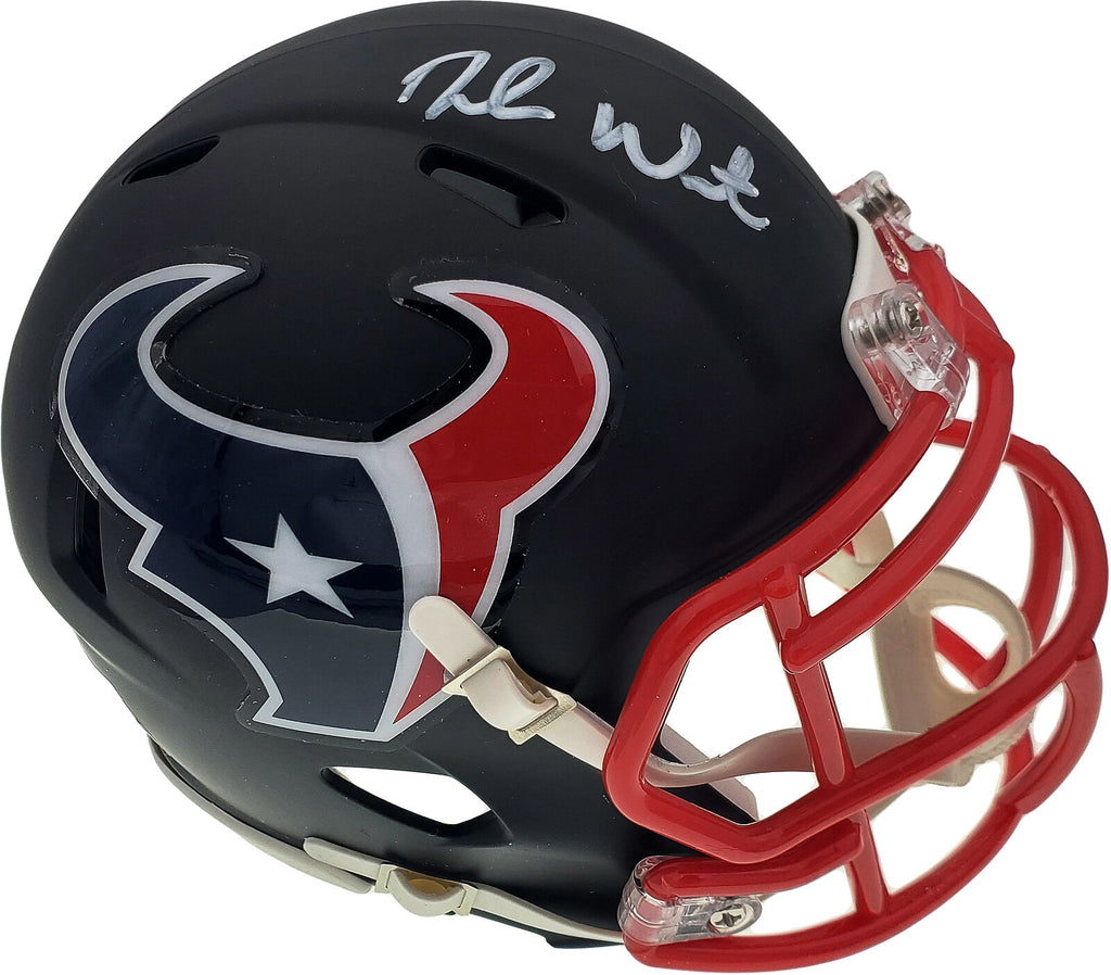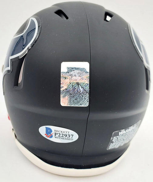 This is a Houston Texans Matte Black Speed Mini Helmet that has been hand signed by Deshaun Watson. It was witnessed being signed by Beckett Authentication Services and comes with their tamper-proof sticker and matching serial numbered certificate of authenticity.