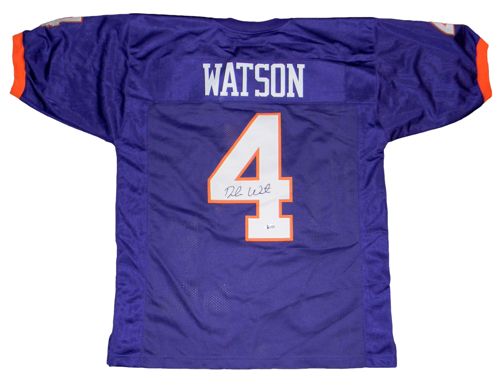 Deshaun Watson, former All-American quarterback for the Clemson Tigers, has hand signed this purple custom jersey. Jersey is size XL and all letters/numbers are sewn-on. This item comes with a certificate of authenticity (COA) from Beckett Authentication Services and was signed in the presence of one of their representatives. You will receive a serial-numbered COA along with a matching serial-numbered sticker on the jersey. The authenticity can be verified online by entering the serial number.Item pictured may not be the exact item you will receive. It will be similar quality, and we guarantee your satisfaction.