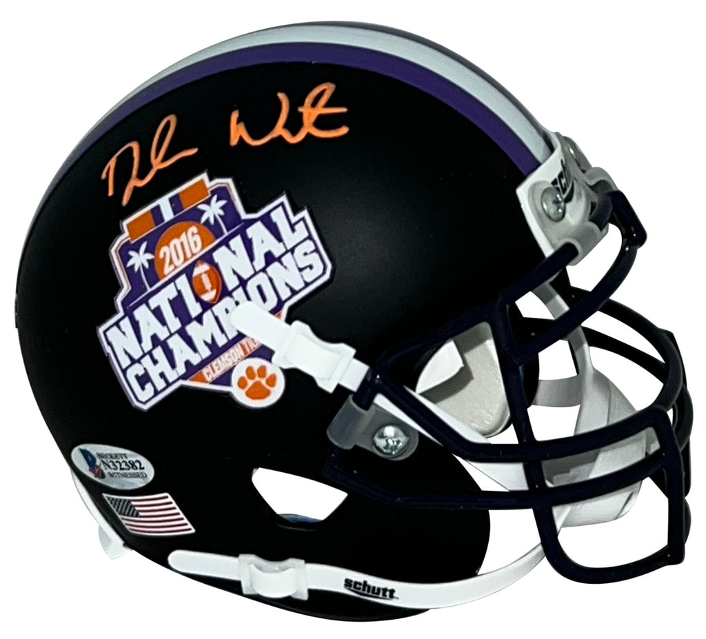 Deshaun Watson, former All-American quarterback for the Tigers, has hand signed this Clemson Schutt mini helmet with the 2016 National Champions decal. This item comes with a certificate of authenticity (COA) from Beckett Authentication Services and was signed in the presence of one of their representatives. You will receive a serial-numbered COA along with a matching serial-numbered sticker on the helmet. The authenticity can be verified online by entering the serial number.Item pictured may not be the exact item you will receive. It will be similar quality, and we guarantee your satisfaction.
