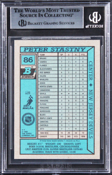 This Autographed 1990 Bowman #86 Card has been Personally Signed by Peter Stastny of the New Jersey Devils. This item is 100% Authentic, it comes slabbed and authenticated by Beckett Authentication Services. The authenticity can be verified on Beckett Authentication Services website.