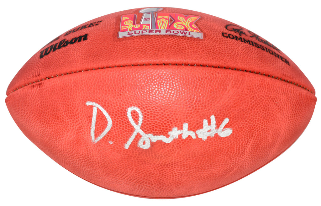 Devonta Smith, star wide receiver for the Philadelphia Eagles, has hand signed this official Wilson Super Bowl LIX game football at a private signing. This item comes with a serial-numbered hologram from Fanatics Authentic, one of the leaders in the industry. The authenticity can be verified online by entering the serial-number. A Fanatics Authentic information card is also included.Item pictured may not be the exact item you will receive. It will be similar quality, and we guarantee your satisfaction.