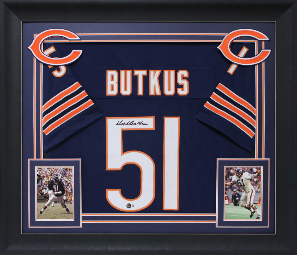 This Autographed Navy Blue Pro Style Framed Jersey has been Personally Signed by Dick Butkus of the Chicago Bears. This item is 100% Authentic to include a hologram by Beckett Authentication Services. This item will come with an affixed Beckett Authentication Services (BAS) authentication sticker, which includes a scannable QR code to verify authenticity. Please note that Beckett no longer provides serial-numbered COA cards, and the attached BAS sticker will serve as the complete authentication for this item. We conducted an autograph signing with Dick Butkus where multiples of the same item were signed. While the photographs are representative of this item, the size, placement and strength of the signature may vary. Each item is hand signed, therefore, each autograph is unique. This item can be verified through BAS. This item has been professionally framed to overall dimensions of approximately 32 x 37 inches. This is a X-Large sized, non-branded, custom-stitched Framed Jersey. This jersey will be framed to order, it will take approximately 3-4 business days from purchase date for it to ship.