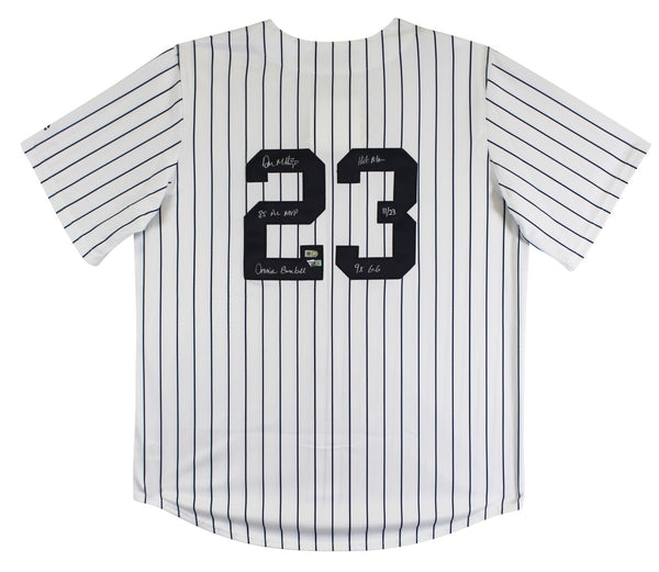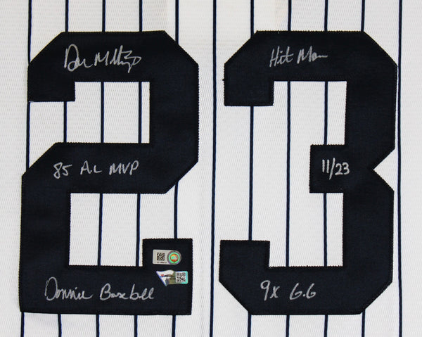 This Autographed White Pinstripe Majestic Cooperstown Collection Limited Edition #11/23 Jersey with the inscription of "Hit Man, Donnie Baseball, 1985 AL MVP, 9x G.G." has been Personally Signed by Don Mattingly of the New York Yankees. This item is 100% Authentic to includes a numbered hologram by Fanatics. The authenticity can be verified on Fanatics website. This is a Large sized Jersey.