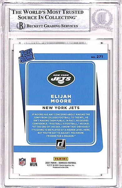 Elijah Moore Signed 2021 Panini Donruss #271 Trading Card BAS 38704 The number in the listing title is just an inventory sku for our records and is not the authentication number. The item pictured is a stock photo unless otherwise noted. This is a slabbed New York Jets 2021 Panini Donruss #PA-30 Trading Card that was personally autographed by Elijah Moore. Includes a certificate of authenticity from Beckett Authentication Services (BAS) and Denver Autographs.