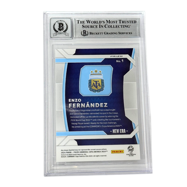 This is a Enzo Fernandez Signed 2024 Panini Prizm Copa America New Era - Beckett Witness. THE ITEM IN THE PICTURE IS A STOCK IMAGE. YOU WILL RECEIVE AN IDENTICAL ITEM OF EQUAL QUALITY. ALL JERSEYS ARE SIZE LARGE. Every item of signed memorabilia we sell is official and of the highest quality. We pride ourselves on providing sports fans with the most exclusive signed memorabilia on the market. We are an industry leading signed memorabilia company who can guarantee 100% authenticity on every signature we sell. The item you receive will be identical to the one you are seeing in the stock pictures. This includes the item, the authentication company, signature color and signature placement. We take pride in ensuring the authenticity of all our items. With unwavering commitment, we guarantee that every signature is 100% authentic. Every item of signed memorabilia comes with a scannable barcode which takes you to the certificate of authenticity on the company's website. These industry leading authentication companies include Beckett Authentication Services, James Spencer Authentication Services and Professional Sports Authentication Services.