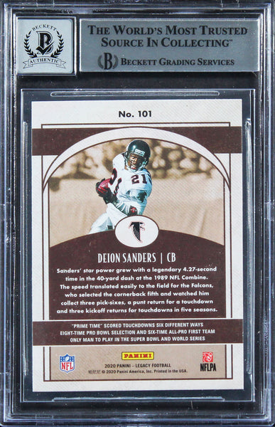 This Autographed Auto Graded Gem Mint 10! 2020 Panini Legacy #101 Card has been Personally Signed by Deion Sanders of the Atlanta Falcons. This item is 100% Authentic, it comes slabbed and authenticated by Beckett Authentication Services. We have multiples of this same item. While the photographs are representative of this item, the size and placement of the signature may vary. Each item is hand signed, therefore, each autograph is unique.
