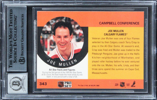 This Autographed Auto Graded Gem Mint 10! 1990 Pro Set #343 Card has been Personally Signed by Joe Mullen of the Calgary Flames. This item is 100% Authentic, it comes slabbed and authenticated by Beckett Authentication Services. The authenticity can be verified on Beckett Authentication Services website.