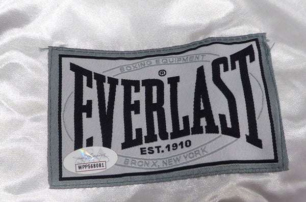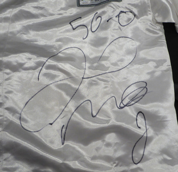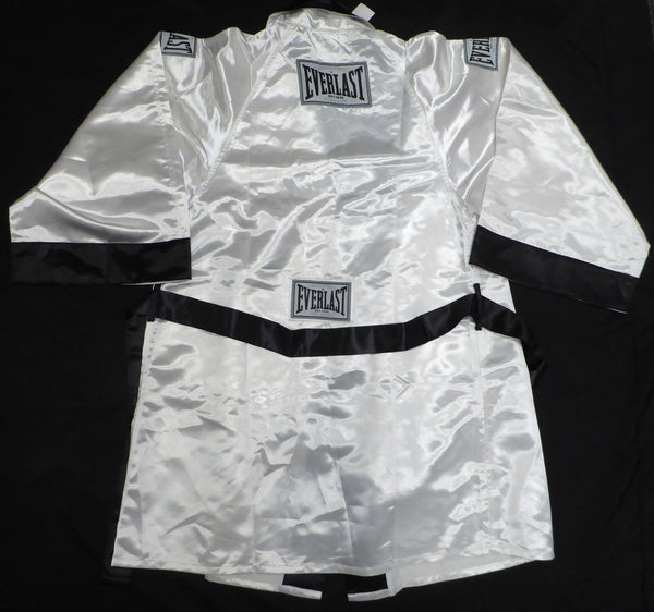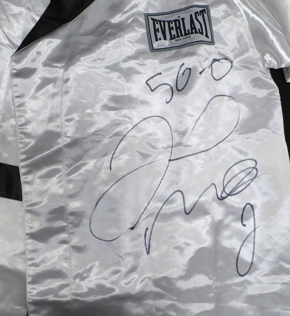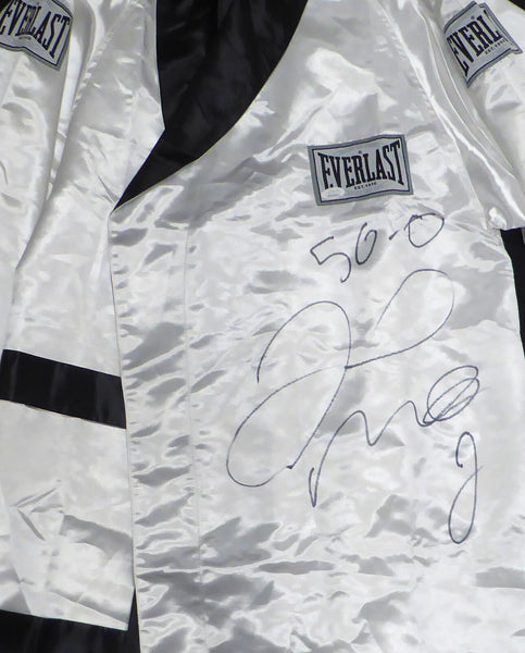 This is a White Everlast Robe that has been hand signed by Floyd Mayweather. This item was inscribed "50-0." This item has been certified authentic by JSA and comes with their tamper-proof sticker and matching certificate of authenticity.