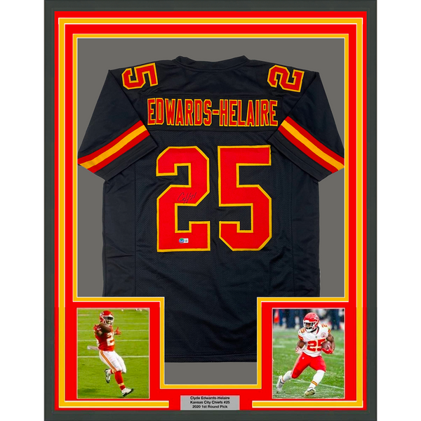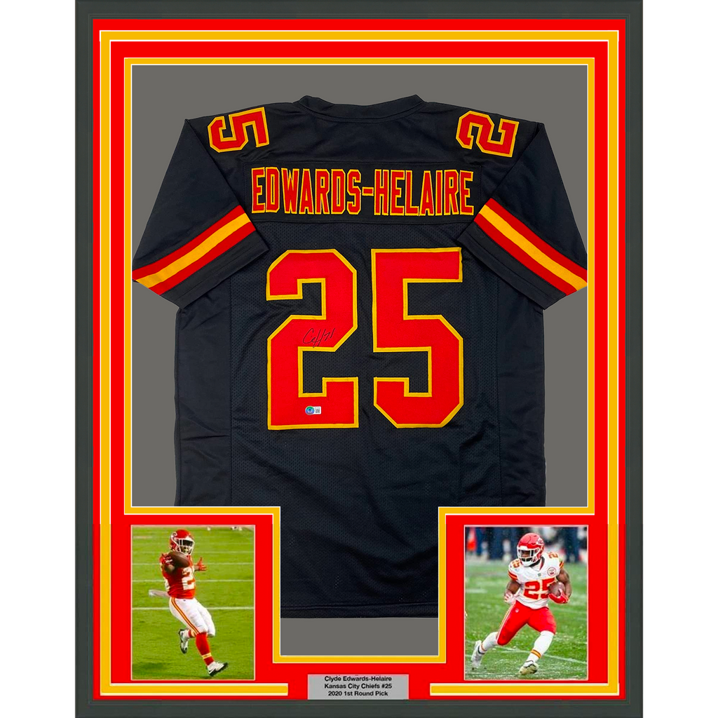 Framed Autographed/Signed Clyde Edwards-Helaire 33x42 KC Black Jersey BAS COA The item is professionally framed & matted with two 8x10 photos, measures 33"x42" and is ready to be hung in your man cave! NOTE: COA card will be mounted on the back of the frame, not inside it on top of the jersey as seen in the picture.