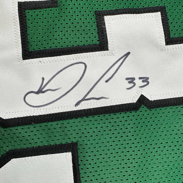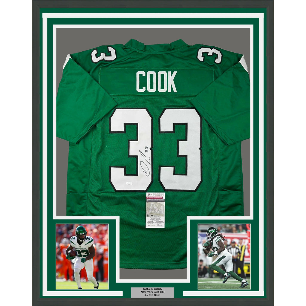 Framed Autographed/Signed Dalvin Cook 33x42 New York Green Jersey JSA COA The item is professionally framed and matted with two 5x7 photos, measures 35 inches by 39 inches and is ready to be hung in your man cave! Photo and matting requests can be made.