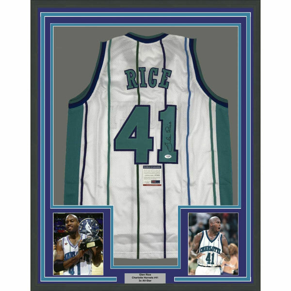FRAMED Autographed/Signed GLEN RICE 33x42 Charlotte White Jersey PSA/DNA COA The item is professionally framed & matted with two 8x10 photos, measures 33"x42" and is ready to be hung in your man cave! NOTE: COA card will be mounted on the back of the frame, not inside it on top of the jersey as seen in the picture. Please allow up to 5 business days for the item to be framed, packaged safely, and picked up by USPS. Photo and matting requests can be made.