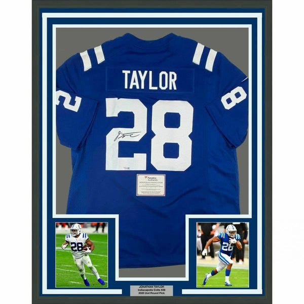 FRAMED Autographed/Signed JONATHAN TAYLOR 33x42 Colts Blue Jersey Fanatics COA