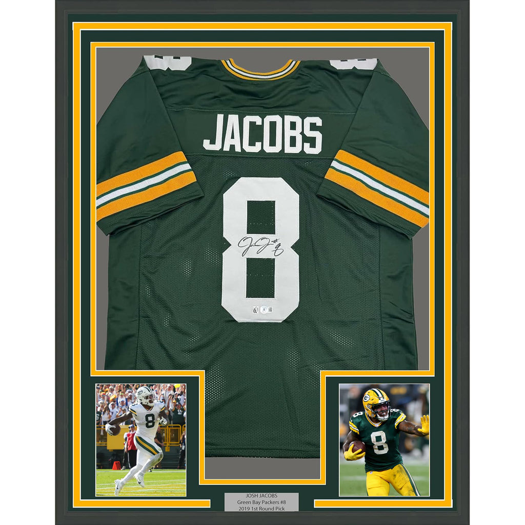 Framed Autographed/Signed Josh Jacobs 35x39 Green Bay Green Jersey Beckett COA The item is professionally framed and matted with two 5x7 photos, measures 35x39 inches and is ready to be hung in your man cave! Photo and matting requests can be made.