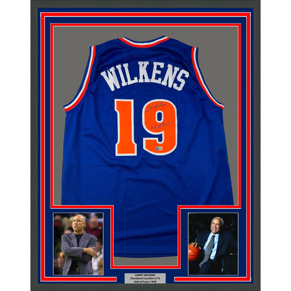 Framed Autographed/Signed Lenny Wilkens 33x42 HOF Blue Basketball Jersey BAS COA The item is professionally framed and matted with two 5x7 photos, measures 35 inches by 39 inches and is ready to be hung in your man cave! Photo and matting requests can be made.