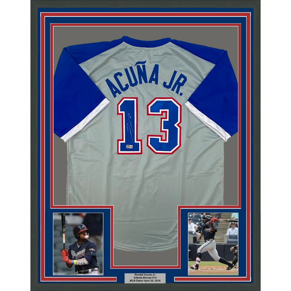 Framed Autographed/Signed Ronald Acuna Jr. 33x42 Atlanta Grey Jersey Beckett COA