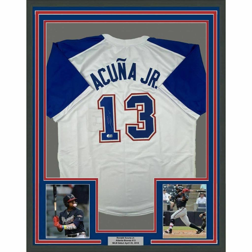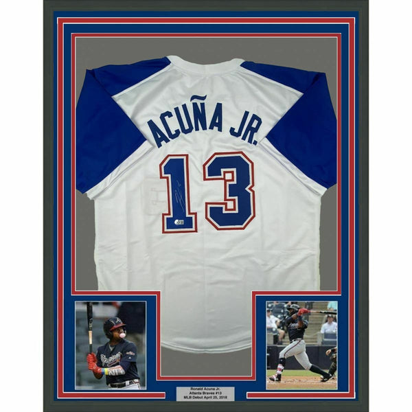 FRAMED Autographed/Signed RONALD ACUNA JR. 33x42 Atlanta Retro Jersey BAS COA The item is professionally framed & matted with two 8x10 photos, measures 33"x42" and is ready to be hung in your man cave! NOTE: COA card will be mounted on the back of the frame, not inside it on top of the jersey as seen in the picture.