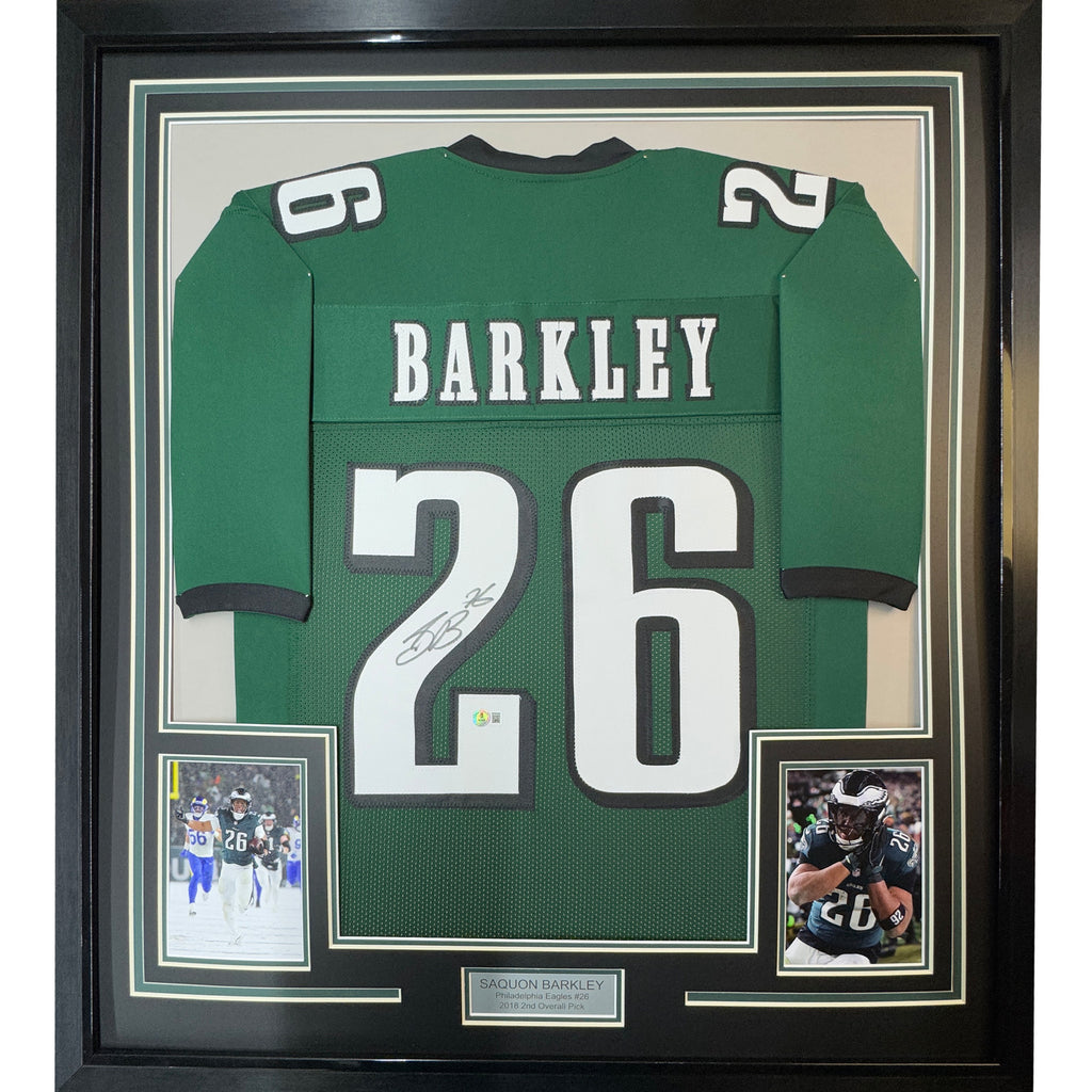 Framed Autographed/Signed Saquon Barkley 35x39 Philadelphia Green Jersey BAS COA The item is professionally framed and matted with two 5x7 photos, measures 35x39 inches and is ready to be hung in your man cave! Photo and matting requests can be made.
