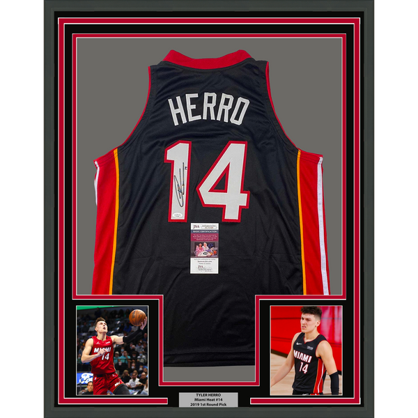 Framed Autographed/Signed Tyler Herro 33x42 Miami Black Jersey JSA COA Jersey has no brand names or logos. This is a custom jersey and was not manufactured by or in any manner associated with any professional sports league or manufacturer. This custom jersey carries no professional sports league designation. The item is intended to be an autographed collectible. The custom jersey displays the name and number of the player. This item in no way is affiliated with or connected to any professional sports organization. Size is XL.