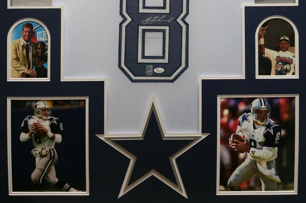 Custom Framed Troy Aikman hand signed Dallas Cowboys style custom jersey.JSA Hologram and COAThe authentication is from JSA. This signature is authenticated by a representative of JSA! 100% AUTHENTIC!!! The jersey has fully stitched numbers on the front and back. It is a great item and a must for all great sports fans!This item is professionally framed, it measures 32"x40" inside , 42"x34" outside , using UV protective Acrylic glass for safe keeping and safe transport, team color matting, black moulding and hanging hooks on the back. All additional items in frame seen in pictures included. 100% ready to hang in your fan cave.