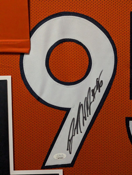 Framed Derek Wolfe hand signed Denver Broncos style Custom Jersey. JSA COA The authentication is from JSA. This signature is authenticated by a representative of JSA! 100% AUTHENTIC!!! The jersey has fully stitched numbers on the front and back. No tags or logos. This is not an official NFL jersey but it is very high quality. It is a great item and a must for all great sports fans! This item is professionally framed, it measures 32"x40" inside , 42"x34" outside , using UV protective Acrylic glass for safe keeping and safe transport, team color matting, black moulding and hanging hooks on the back. All additional items in frame seen in pictures included. 100% ready to hang in your fan cave.