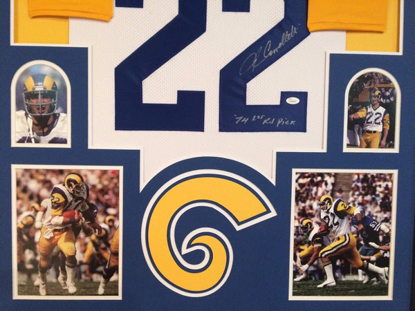 Custom Framed John Cappelletti hand signed inscribed "'74 1st Rd Pick" L.A. Rams custom jersey.JSA Hologram and COA(#WP68598)The authentication is from JSA. This signature is not authenticated by opinion but it is WITNESSED by a representative of JSA! 100% AUTHENTIC!!! The jersey has fully stitched numbers on the front and back. It is a great item and a must for all great sports fans!This item is professionally framed, it measures 32"x40" inside , 42"x34" outside , using UV protective Acrylic glass for safe keeping and safe transport, team color matting, black moulding and hanging hooks on the back. All additional items in frame seen in pictures included. 100% ready to hang in your fan cave.