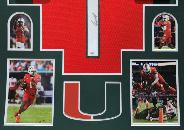 Custom Framed Cam Ward hand signed Miami Hurricanes style custom jersey.JSA Hologram and COAThe authentication is from JSA. This signature is not authenticated by opinion but it is WITNESSED by a representative of JSA! 100% AUTHENTIC!!! The jersey has fully stitched numbers on the front and back. It is a great item and a must for all great sports fans!Stock photos are used for auctions. Will receive equal quality.This item is professionally framed, it measures 32"x40" inside , 42"x34" outside , using UV protective Acrylic glass for safe keeping and safe transport, team color matting, black moulding and hanging hooks on the back. All additional items in frame seen in pictures included. 100% ready to hang in your fan cave.