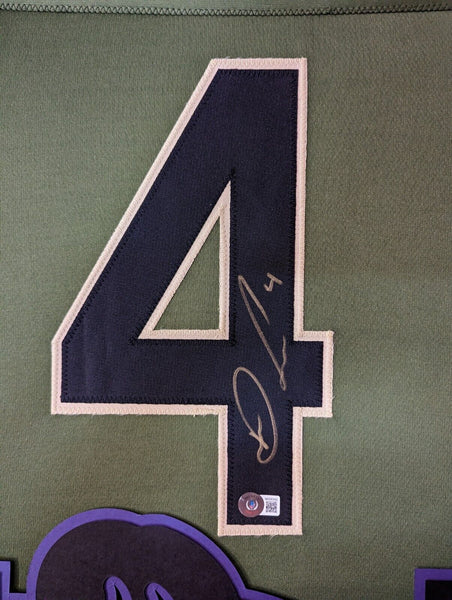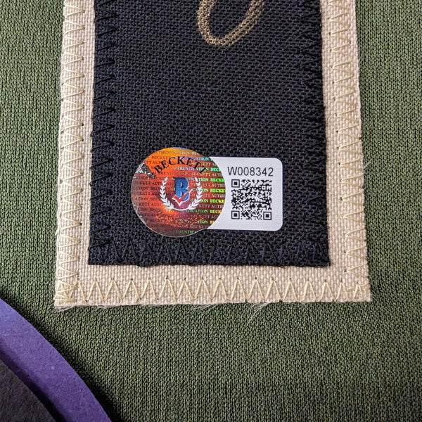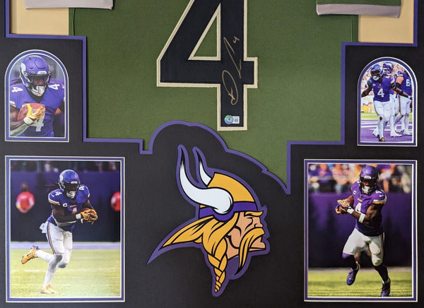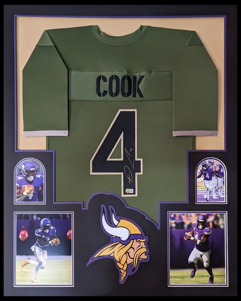 Custom Framed Dalvin Cook hand signed Minnesota Vikings style custom Salute to Service jersey.BECKETT HologramThe authentication is from BAS. This signature is authenticated by a representative of BAS! 100% AUTHENTIC!!! The jersey has fully stitched numbers on the front and back. It is a great item and a must for all great sports fans!This item is professionally framed, it measures 32"x40" inside , 42"x34" outside , using UV protective Acrylic glass for safe keeping and safe transport, team color SUEDE matting, black moulding and hanging hooks on the back. All additional items in frame seen in pictures included. 100% ready to hang in your fan cave.