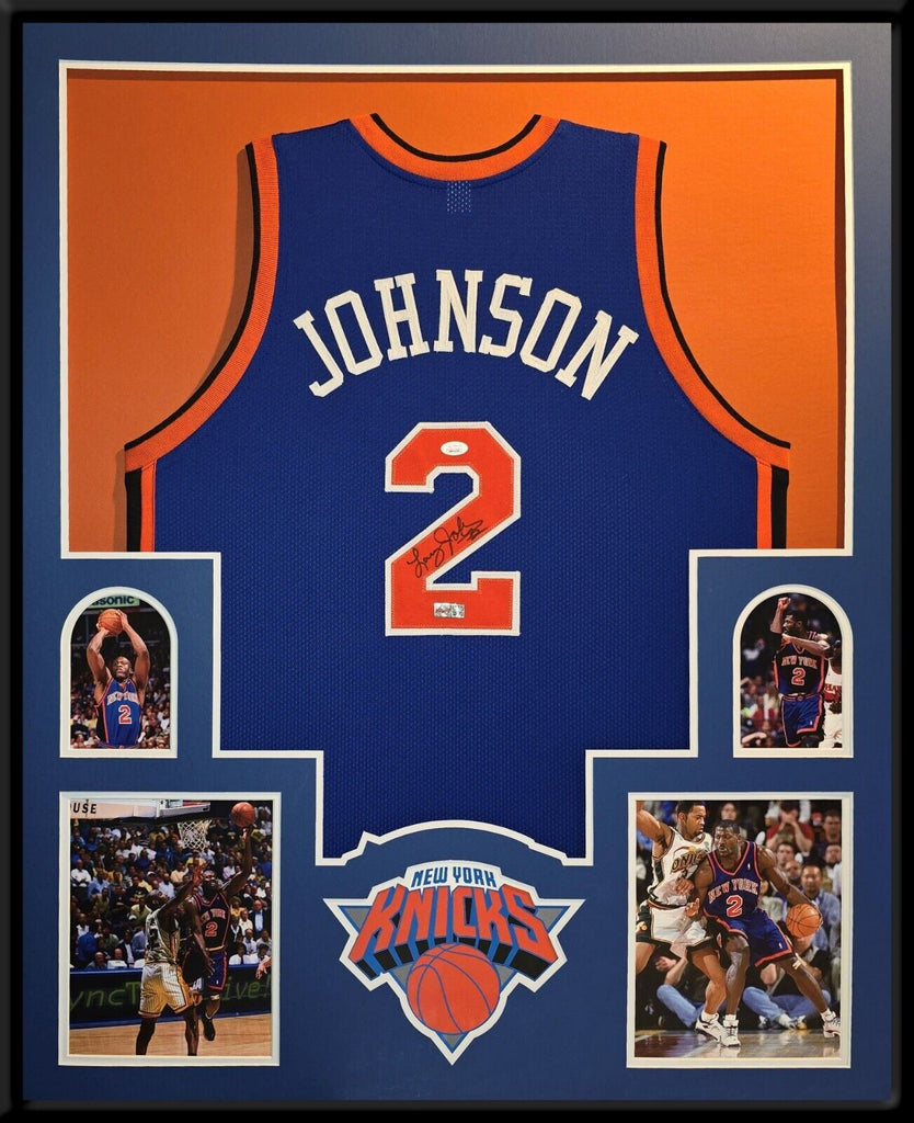 Custom Framed Larry Johnson hand signed New York Knicks style custom jersey.JSA COAThe authentication is from JSA. This signature is authenticated by a representative of JSA! 100% AUTHENTIC!!! The jersey has fully stitched numbers on the front and back. It is a great item and a must for all great sports fans!This item is professionally framed, it measures 32"x40" inside , 42"x34" outside , using UV protective Acrylic glass for safe keeping and safe transport, team color matting, black moulding and hanging hooks on the back. All additional items in frame seen in pictures included. 100% ready to hang in your fan cave.