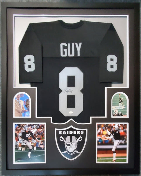 Custom Framed Ray Guy signed Oakland Raiders style custom jersey.JSA Hologram and COA (#WP423092)The authentication is from JSA. 100% AUTHENTIC!!! The jersey has fully stitched numbers on the front and back. It is a great item and a must for all great sports fans!This item is professionally framed, it measures 32"x40" inside , 42"x34" outside , using UV protective Acrylic glass for safe keeping and safe transport, team color matting, black moulding and hanging hooks on the back. All additional items in frame seen in pictures included. 100% ready to hang in your fan cave.
