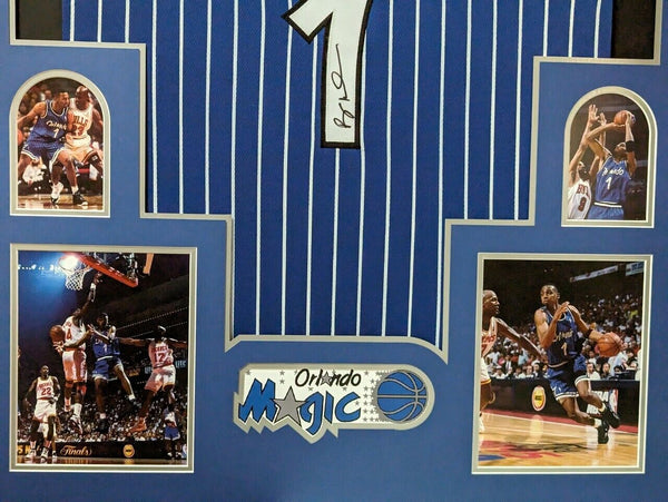 Custom Framed in Penny Hardaway hand signed Orlando Magic style custom jersey PSA Hologram and COA The authentication is from PSA. This signature is WITNESSED by a representative of PSA! 100% AUTHENTIC!!! The jersey has fully stitched numbers on the front and back. It is a great item and a must for all great sports fans! This item is professionally framed, it measures 32"x40" inside , 42"x34" outside , using UV protective Acrylic glass for safe keeping and safe transport, team color matting, black moulding and hanging hooks on the back. All additional items in frame seen in pictures included. 100% ready to hang in your fan cave.