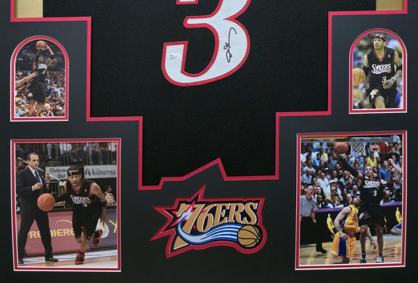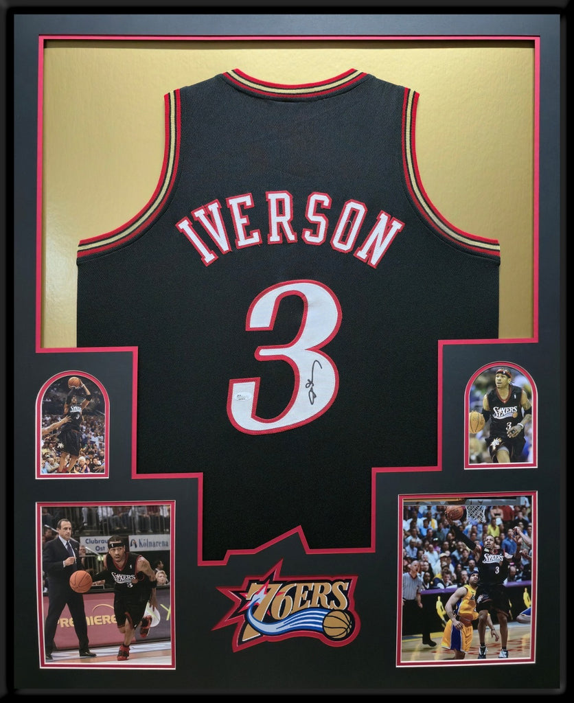 Custom Framed Allen Iverson signed custom Philadelphia 76ers style jersey.JSA COAThe authentication is from JSA. This signature is authenticated by a representative of JSA! 100% AUTHENTIC!!! The jersey has fully stitched numbers on the front and back. It is a great item and a must for all great sports fans!This item is professionally framed, it measures 32"x40" inside , 42"x34" outside , using UV protective Acrylic glass for safe keeping and safe transport, team color matting, black moulding and hanging hooks on the back. All additional items in frame seen in pictures included. 100% ready to hang in your fan cave.