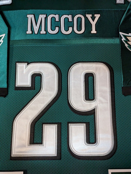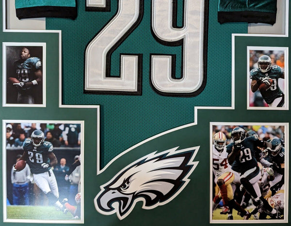 Custom Framed LeSean McCoy Philadelphia Eagles jersey displayThis item is professionally framed, it measures 32"x40" inside , 42"x34" outside , using UV protective Acrylic glass for safe keeping and safe transport, team color matting, black moulding and hanging hooks on the back. All additional items in frame seen in pictures included. 100% ready to hang in your fan cave.