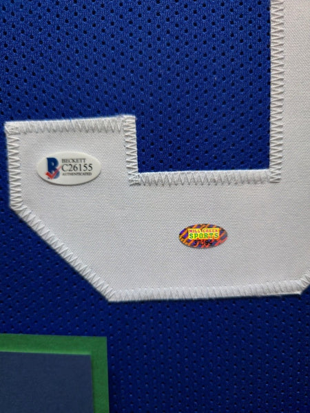 Custom Framed Cortez Kennedy hand signed Seattle Seahawks style custom jersey.Beckett COAThe authentication is from Beckett. This signature is WITNESSED by a representative of Beckett! 100% AUTHENTIC!!! The jersey has fully stitched numbers on the front and back. It is a great item and a must for all great sports fans!Stock photos are used for auctions. Will receive equal quality.This item is professionally framed, it measures 32"x40" inside , 42"x34" outside , using UV protective Acrylic glass for safe keeping and safe transport, team color matting, black moulding and hanging hooks on the back. All additional items in frame seen in pictures included. 100% ready to hang in your fan cave.