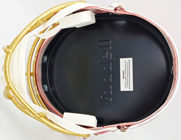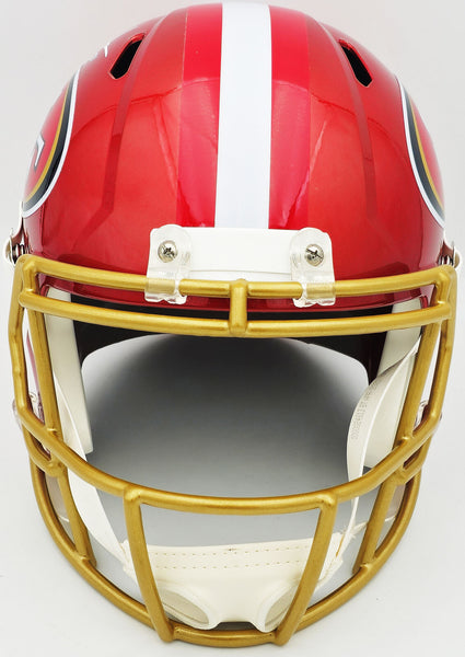 This is a San Francisco 49ers Flash Red Full Size Speed Replica Helmet that has been hand signed by Frank Gore. The Flash helmets are delicate and may have some marks or scratches on them. This item has been witnessed and certified authentic by Beckett Authentication (BAS) and comes with their tamper-proof witness sticker.