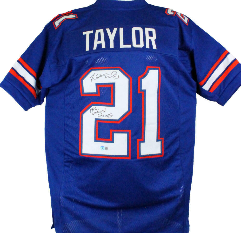 Fred Taylor Autographed Blue College Style Jersey w/ 96 Natl Champs-Beckett W Hologram THIS IS NOT AN NCAA JERSEY. THIS HAS NO TAGS, NO LOGOS, NO EMBLEMS. This is a hand autographed Jersey of Fred Taylor. Inscribed 96 National Champs. This is Custom Made (non name brand) Authentic Style (stitched letters and numbers). This item has a Beckett Witnessed Authentication, which comes with a numbered sticker hologram and a generic Beckett Certificate of Authenticity. You can view this item on the Beckett Authentication website. It was signed either at a public autograph appearance or a private signing. This is a stock photo of the item. Although you may not receive this exact item, the item you receive is virtually identical and brand new in great shape. Jersey size is XL.
