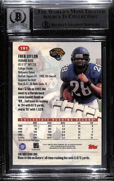 Fred Taylor Signed 1998 Topps Stadium Club #191 Card Grade 10 Beckett 43892 The number in the listing title is just an inventory sku for our records and is not the authentication number. The item pictured is a stock photo unless otherwise noted. This is a Jacksonville Jaguars 1998 Stadium Club #191 Slabbed Trading Card with a Grade 10 Auto that was personally autographed by Fred Taylor. Includes a certificate of authenticity from Beckett Authentication Services (BAS) and Denver Autographs.
