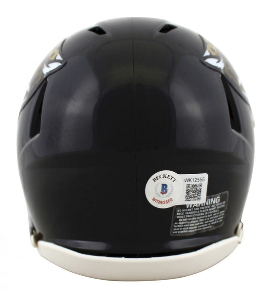 Riddell Jacksonville Jaguars speed mini helmet. Hand-signed by Fred Taylor.The lot / autograph(s) includes an official Beckett Authentication Services serially-numbered hologram and matching COA for authenticity purposes. The signing of this item was witnessed by Beckett.Authentication: Beckett COA