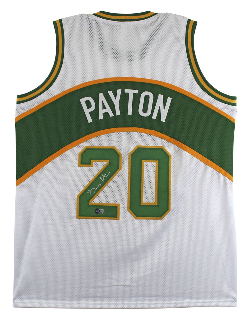 This Autographed Green Pro Style Jersey has been Personally Signed by Gary Payton of the Seattle Supersonics. This item is 100% Authentic to include a hologram by Beckett Authentication Services. This item will come with the new Beckett Authentication hologram that has a scannable QR code rather than the traditional COA. If you would like to have a COA, you are welcome to reach out to Beckett for a printed certification once you receive your item. This is a BAS Witnessed Protection Program item which means a Beckett Authentication Service representative was present when this item was being signed. We conducted an autograph signing with Gary Payton where multiples of the same item were signed. While the photographs are representative of this item, the size, placement and strength of the signature may vary. Each item is hand signed, therefore, each autograph is unique. This item can be verified through BAS Witnessed. This is a X-Large sized, non-branded, custom-stitched Jersey.