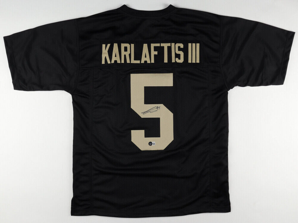 Custom on-field style jersey. Everything sewn on, size XL. Hand-signed by George Karlaftis.The lot / autograph(s) includes an official Beckett Authentication Services serially-numbered hologram for authenticity purposes. The signing of this item was witnessed by Beckett.Authentication: Beckett Hologram
