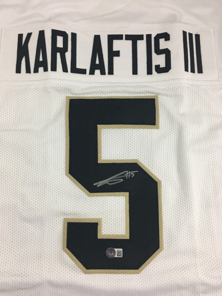 Custom on-field style jersey. Everything sewn on, size XL. Hand-signed by George Karlaftis.The lot / autograph(s) includes an official Beckett Authentication Services serially-numbered hologram for authenticity purposes. The signing of this item was witnessed by Beckett.Authentication: Beckett Hologram