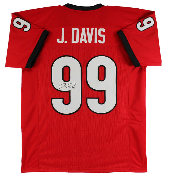 This Autographed Red Pro Style Jersey has been Personally Signed by Jordan Davis of the Georgia Bulldogs. This item is 100% Authentic to include a hologram by James Spence Authentication Services. This item will come with an affixed James Spence Authentication Services (JSA) authentication sticker, which includes a scannable QR code to verify authenticity. Please note that JSA no longer provides serial-numbered COA cards with witnessed items, and the attached JSA sticker will serve as the complete authentication for this item. This is a JSA Witnessed Protection Program item which means a JSA representative was present when this item was being signed. This is a X-Large sized, non-branded, custom-stitched Jersey.