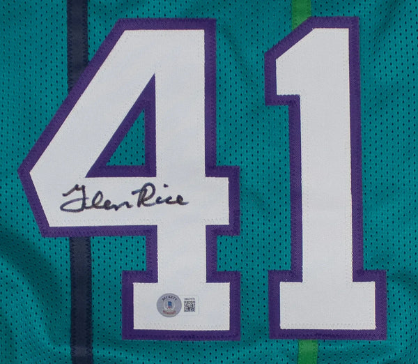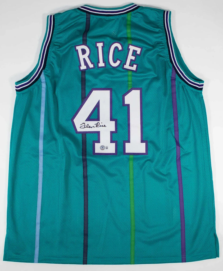 This autographed custom on-court style adult XL jersey has been personally hand-signed by Glen Rice of the Charlotte Hornets. This autograph is certified by Beckett Authentication Services (BAS) Witness Certification. That means that a Beckett representative was present when this item was signed. It comes with the numbered authentication hologram with a QR code that verifies the authentication on the Beckett website.Custom on-court style jerseys are a more affordable option for autograph seekers. These jerseys do not have any brand name or tags and are made in the Philippines. They feature stitched on names and numbers and are made to look very similar to the on-field jerseys that the players wear. These custom jerseys are very commonly used in the memorabilia industry.
